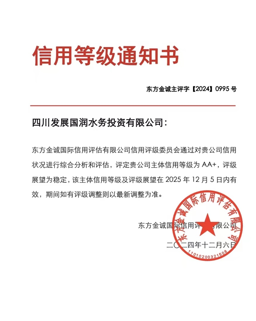 匠心耕耘,喜撷硕果。经国内权威评级机构东方金诚国际信用评估有限公司日前评定,清新环境子公司四川发展国润水务投资有限公司(以下简称“国润水务”)成功获评“AA+”主体信用评级,评级展望为稳定。