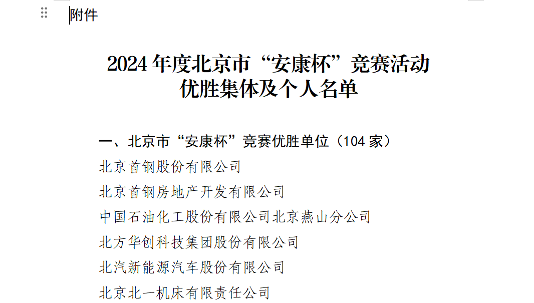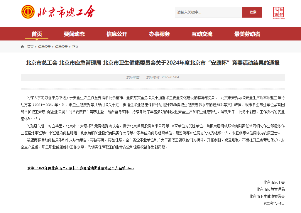 近日,北京清新环境技术股份有限公司凭借在安全生产与职工健康保障方面的卓越表现,荣获“2024年度北京市‘安康杯’竞赛活动优胜单位”称号。这一荣誉由北京市总工会、北京市应急管理局、北京市卫生健康委员会联合颁发,是对公司在安全健康管理领域不懈努力的高度认可。